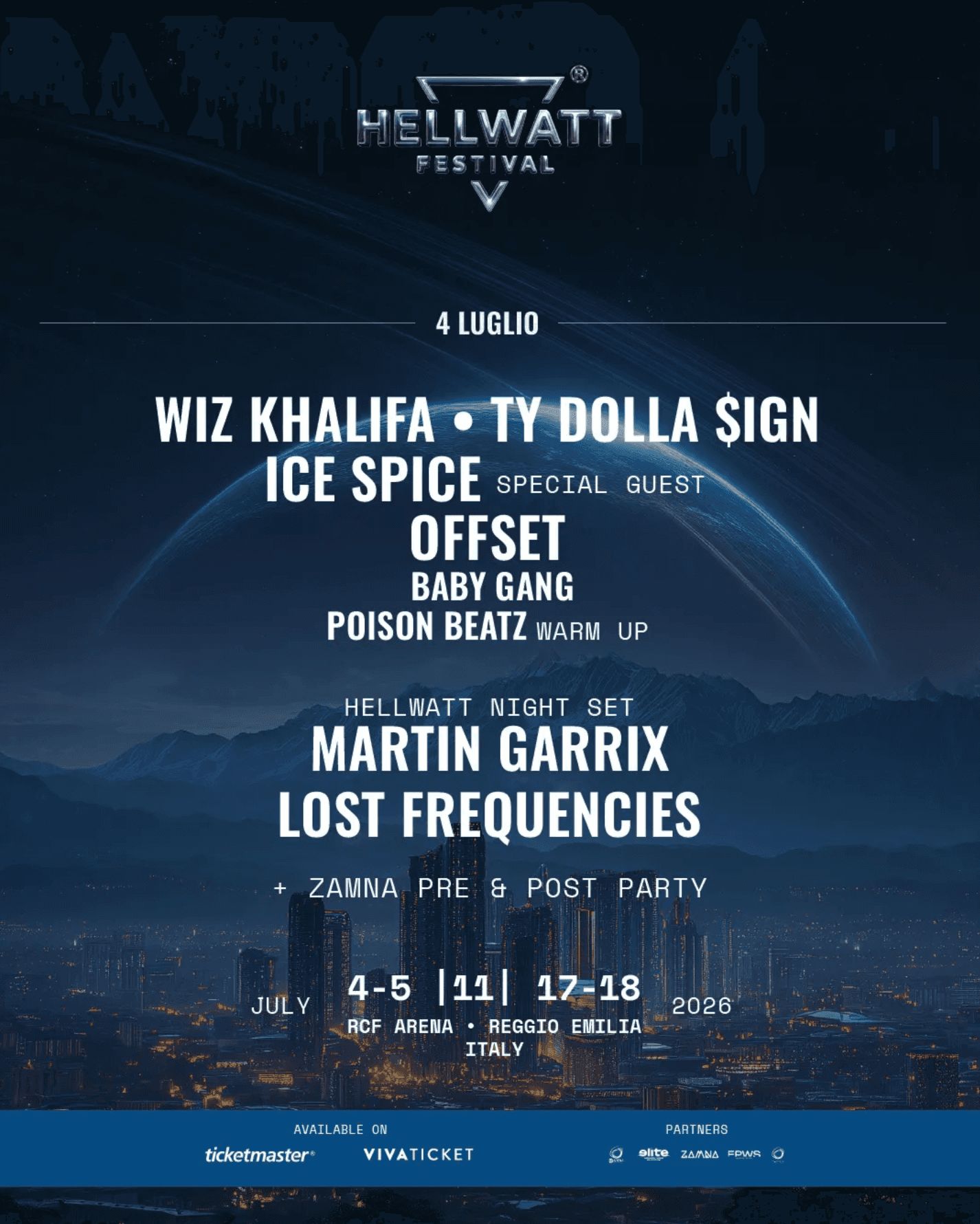 Tickets available on Ticketmaster & Vivaticket 12:00 PM — Zamna Pre-Party @ Iren Green Park (until 6:00 PM) 4:45 PM — Main Stage Early Entry 5:00 PM — Main Stage Opens Warm-Up — Poison Beatz Baby Gang Offset Ice Spice Ty Dolla $ign Wiz Khalifa TBC EDM Intro Night Lost Frequencies Martin Garrix After Party — Zamna @ Iren Green Park