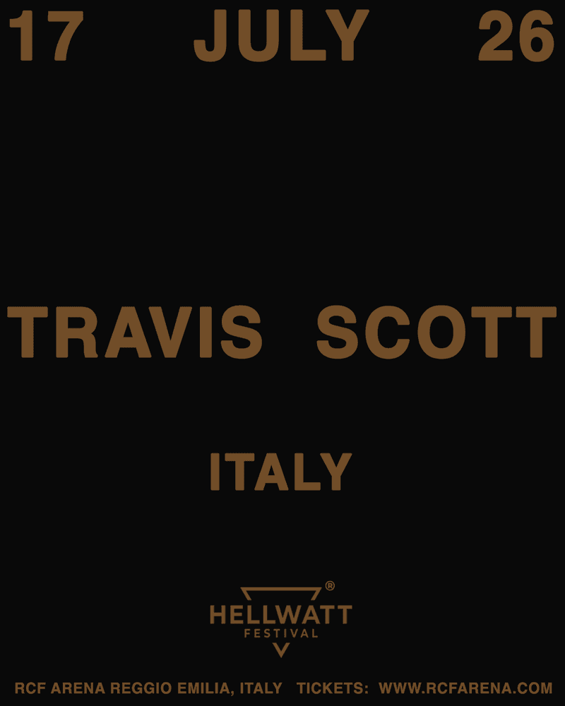 Travis Scott will perform on July 17, 2026 on the Main Stage at Hellwatt Festival, RCF Arena, Reggio Emilia.