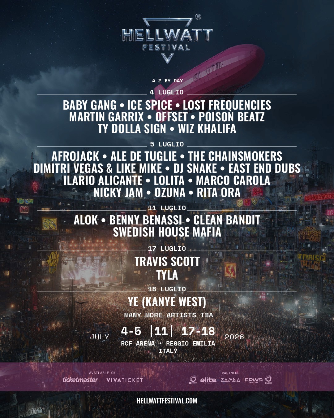 Five nights. 103,000 people per night. Europe's largest outdoor arena. And a lineup that has never been assembled on Italian soil before.Spread across July 4–5, 11, and 17–18 at RCF Arena in Reggio Emilia, the full Hellwatt 2026 Main Stage lineup brings together the defining names of global music — across rap, electronic, pop, and beyond.
